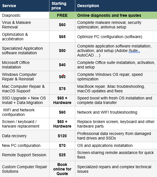 Nous croyons en une tarification transparente et équitable pour des réparations informatiques de qualité. Chaque intervention commence par un diagnostic gratuit, et vous ne payez que lorsque nous réparons avec succès votre appareil.