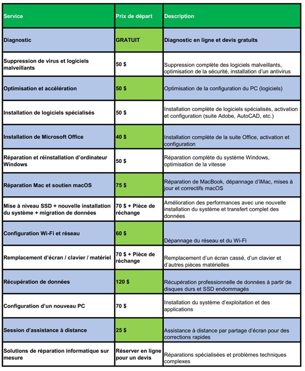 Nous croyons en une tarification transparente et équitable pour des réparations informatiques de qualité. Chaque intervention commence par un diagnostic gratuit, et vous ne payez que lorsque nous réparons avec succès votre appareil.